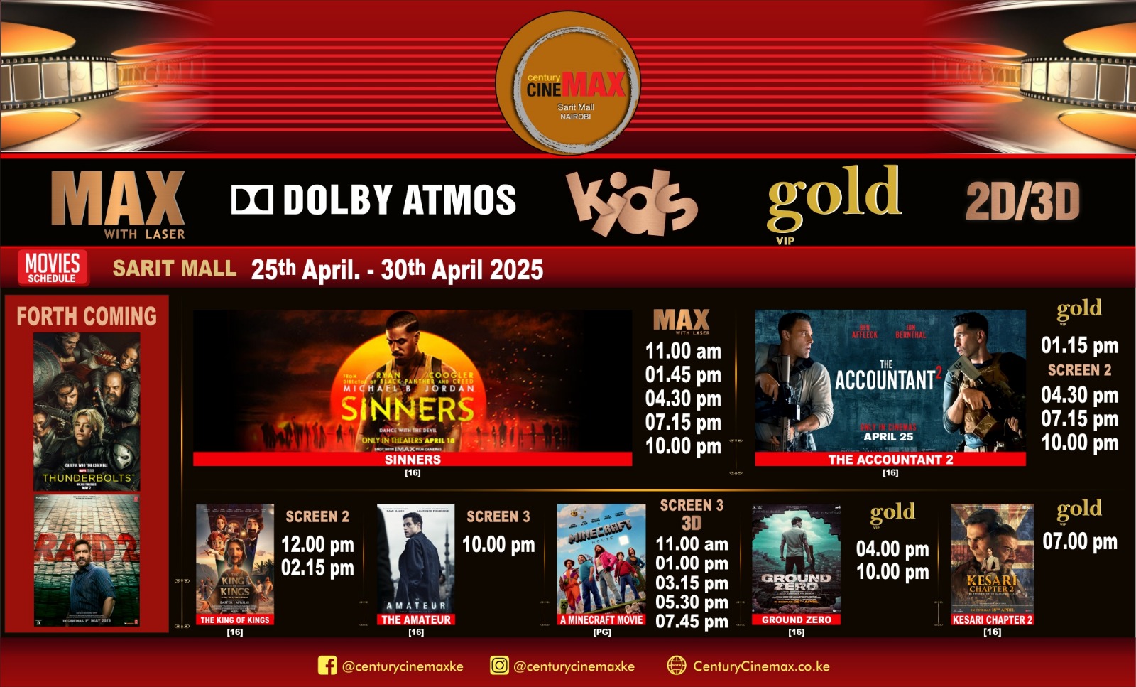 Century Cinemax is the largest film exhibition company in Kenya. Century pioneered the multiplex revolution in Kenya by establishing the multiplex cinema in 2020 at Sarit Mall, Nairobi, currently with a Cinema of 4 screens.